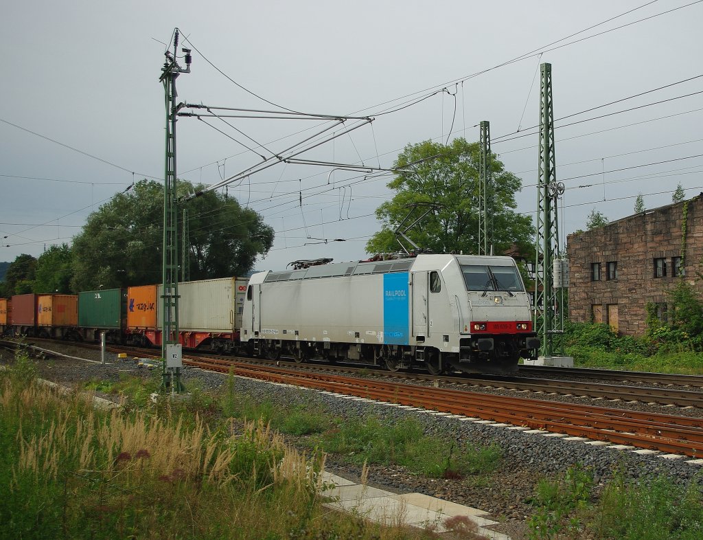 185 639-2 mit Containerzug in Fahrtrichtung Norden. Aufgenommen am 07.09.2010 am Bü Eltmannshausen/Eschwege West.