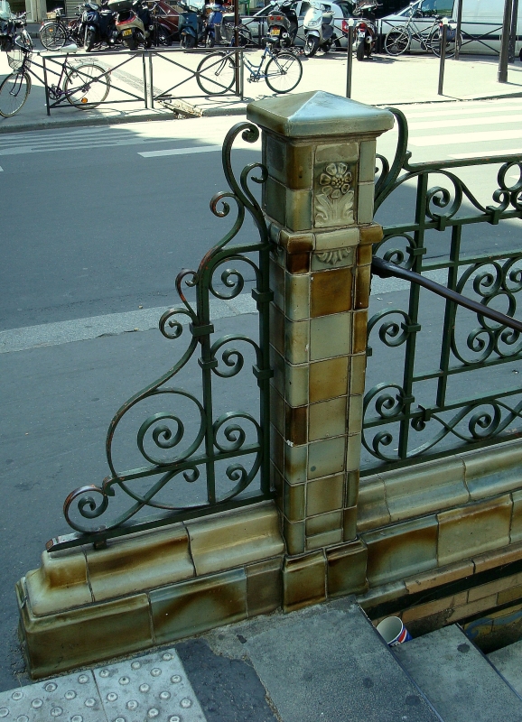 Aufwendig gestalteter Metroeingang in der Straßenmitte, an der Station Rue du Bac - Linie 12. 15.7.2007
