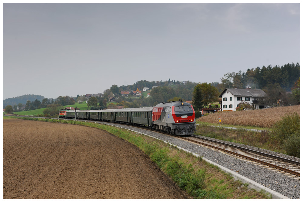 Im Zuge der Feier "150 Jahre GKB" am 16.10.2010 in Lieboch fuhr die 218.256 von Lieboch nach Krottendorf-Ligist und zurück. Hier bei der Ausfahrt Söding-Mooskirchen Richtung Krottendorf. Am Zughaken der aus Wien kommende Sonderzug inkl. 1110.524 am Zugschluss.