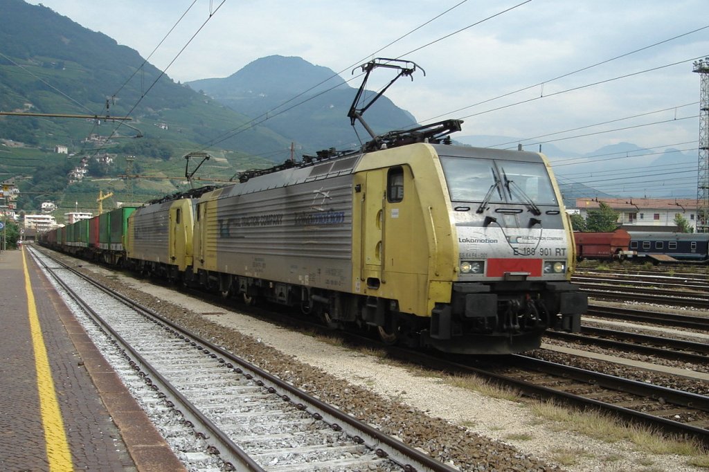E 188 in Doppeltraktion mit einem Güterzug vom Brenner kommend in Bolzano 2.10.10