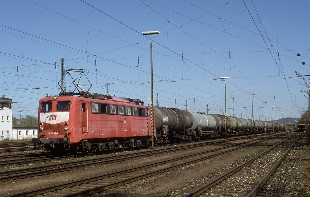 Eine BR145 bei der Durchfahrt mit einem Kesselwagenzug in Düren