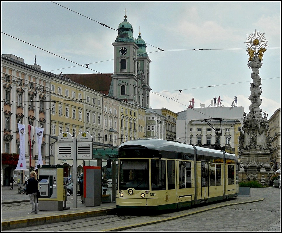 Der schöne nostalgische Wagen 501 der Pöstlingbergbahn harmoniert hervorragend mit dem Stadtbild am Hauptplatz in Linz. 14.09.2010 (Jeanny)