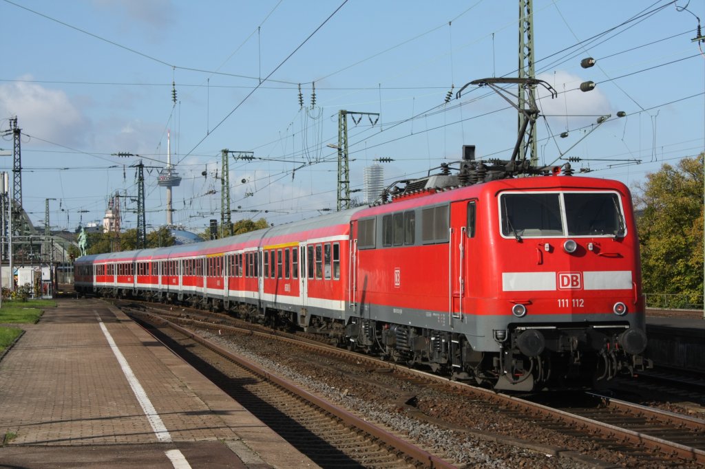 Die 111 112 schiebt einen n-Wagen Park am 24.10.2010 durch Köln Messe/Deutz richtung Köln Hbf.