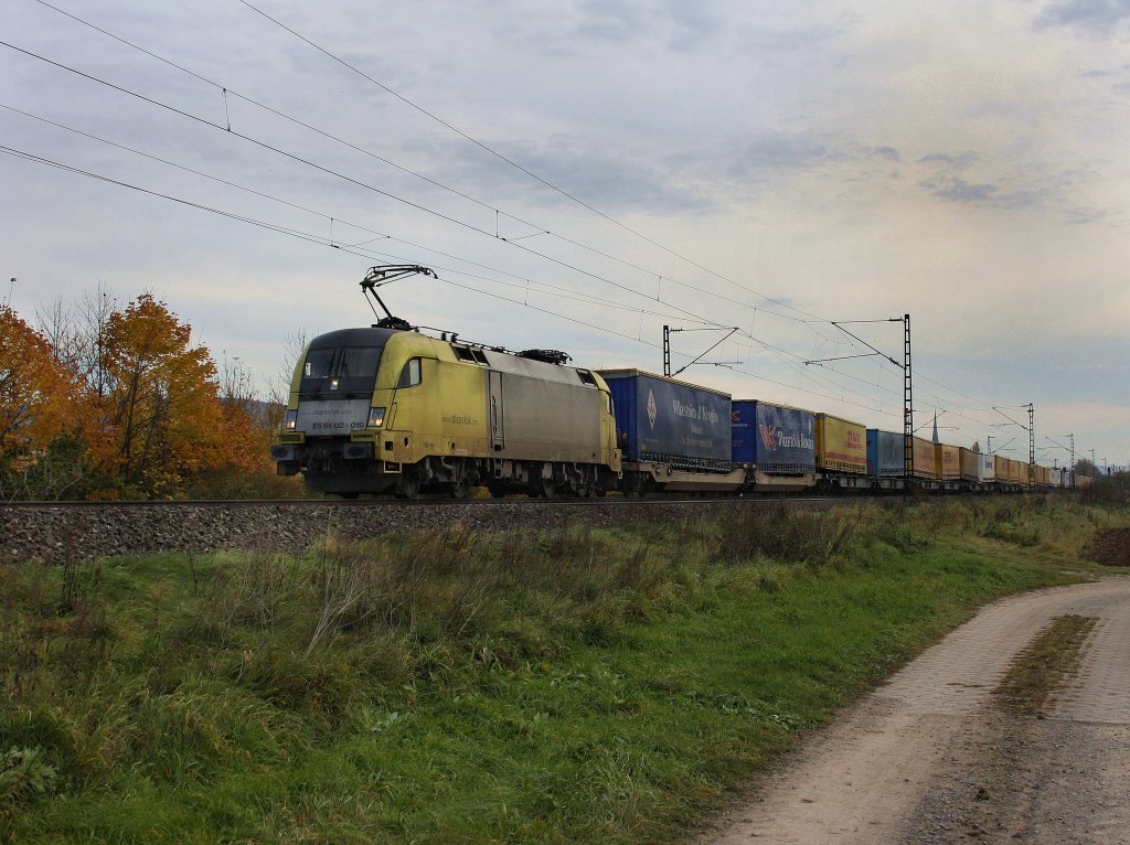 Die ES 64 U2-010 am 30.10.2010 mit einem KLV-Zug unterwegs bei Thüngersheim.