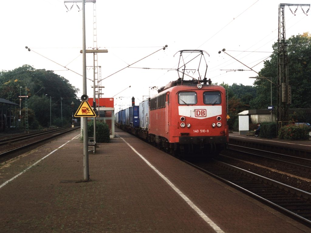 Die mit Fernlichtern ausgestattete 140 510-9 mit eine Güterzug auf Bahnhof Salzbergen am 28-9-2001. Bild und scan: Date Jan de Vries.