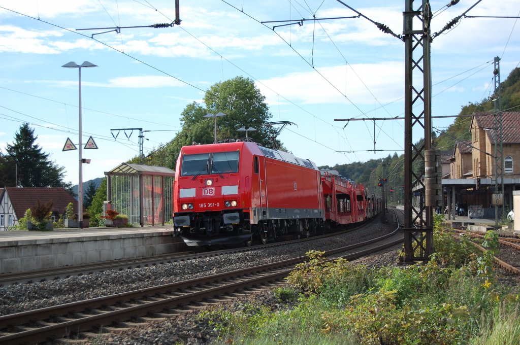 185 391-0 durchfuhr am 03.10.2010 mit einem leeren Autozug den Bahnhof Altenbeken.