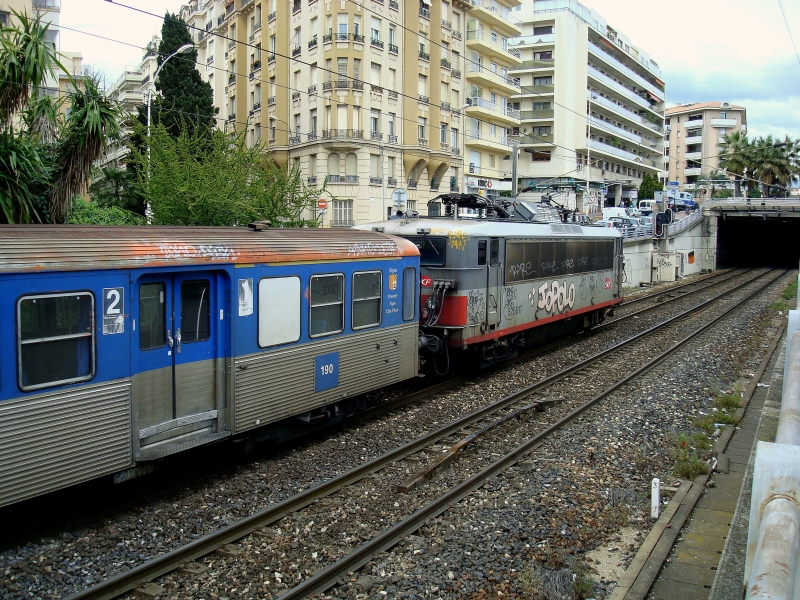 Schnellzug nach Nizza und Regionalverkehr am östlichen Rand der Innenstadt von Cannes. Hier taucht die Strecke ab in einen Tunnel aus Betonelementen. Obendrauf verläuft eine Schnellstraße. Praktisch, aber an manchen Stellen auch ganz schön hässlich! 31.3.2009