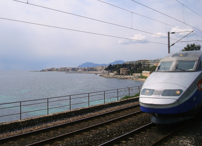 Ein TGV auf der Fahrt nach Nizza, am östlichen Stadtrand von Cannes. Die Strecke verläuft hier direkt am Mittelmeer entlang.