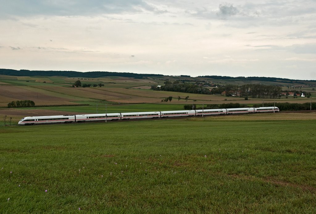 Sonntag Mittag, 12.09.2010: Ein ICE düst über die Verbindungskurve beim "Abzweig Himmelsthür" von der NBS kommend Richtung Hildesheim. Das ganze ist bei Emmerke und konnte von dem Rest einer aufgelassenen Strasse die weiter rechts die Trasse gekreuzt hätte, gut fotografiert werden. Da geht schön ein Rad- und Fußweg vorbei.