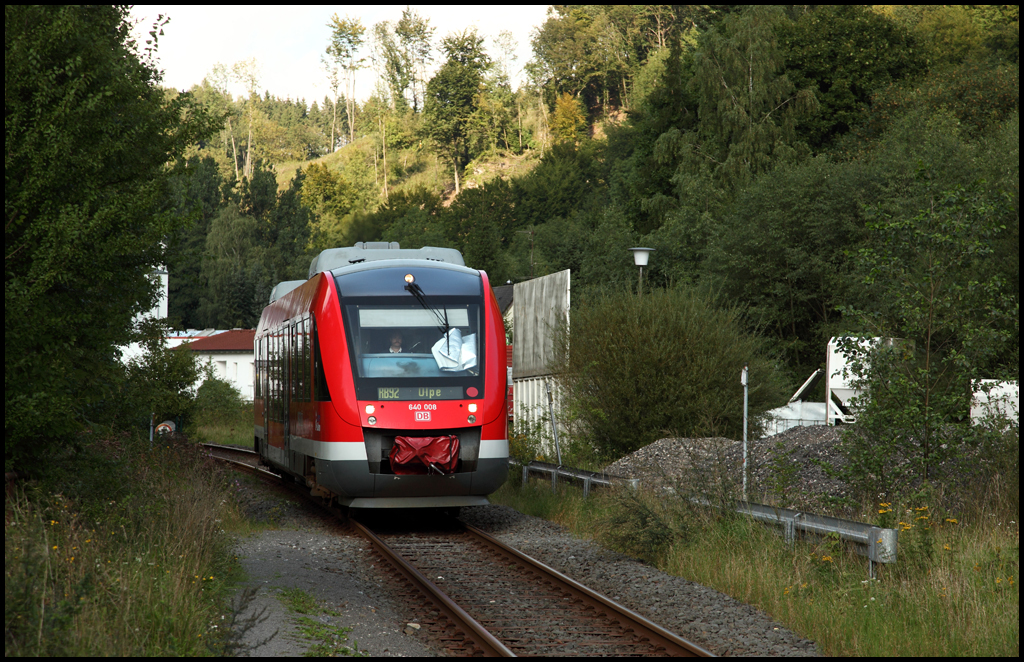 640 008 hat als RB92 "Biggesee-Express", Finnentrop - Olpe, den Bedarfshalt Heggen erreicht. (04.09.2010)