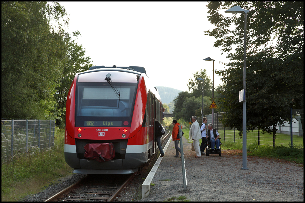 640 008 erreicht als RB92 "Biggesee-Express", Finnentrop - Olpe, den Bedarfshalt Heggen. (04.09.2010)