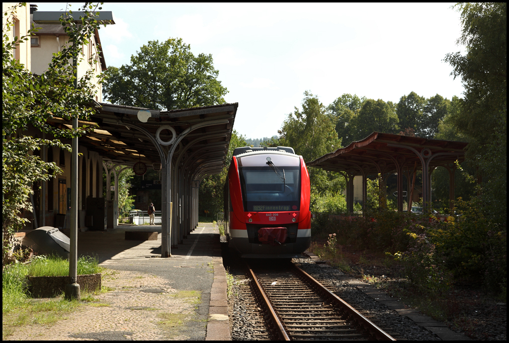 Das ist aus Olpe geworden.... Ein Gleis ist übrig geblieben. 640 008 hat den Endpunkt erreicht und wird in einigen Minuten zurück nach Finnentrop fahren. (04.09.2010)