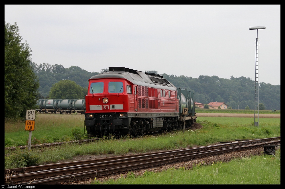 233 511 fährt mit einem Güterzug aus Richtung Alt Ötting kommend in den Bahnhof Tüssling ein.
