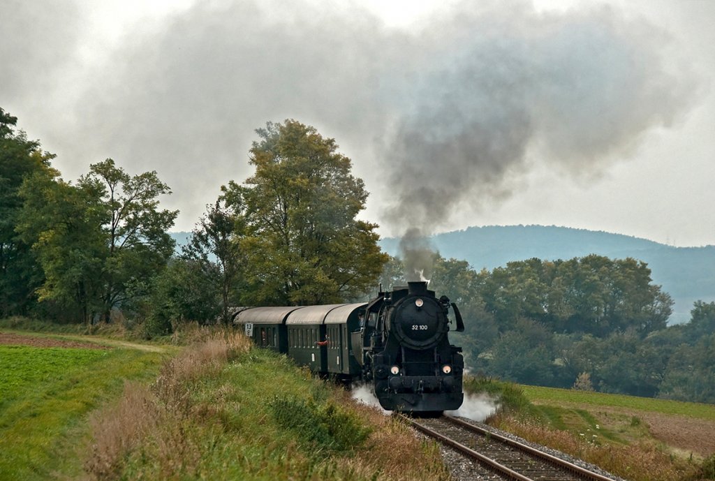 BR 52 1001 bringt den REX 7388 "NostalgieExpress Leiser Berge" von Korneuburg nach Ernstbrunn. Die Aufnahme entstand am 25.09.2010 zwischen Mollmannsdorf und Würnitz.