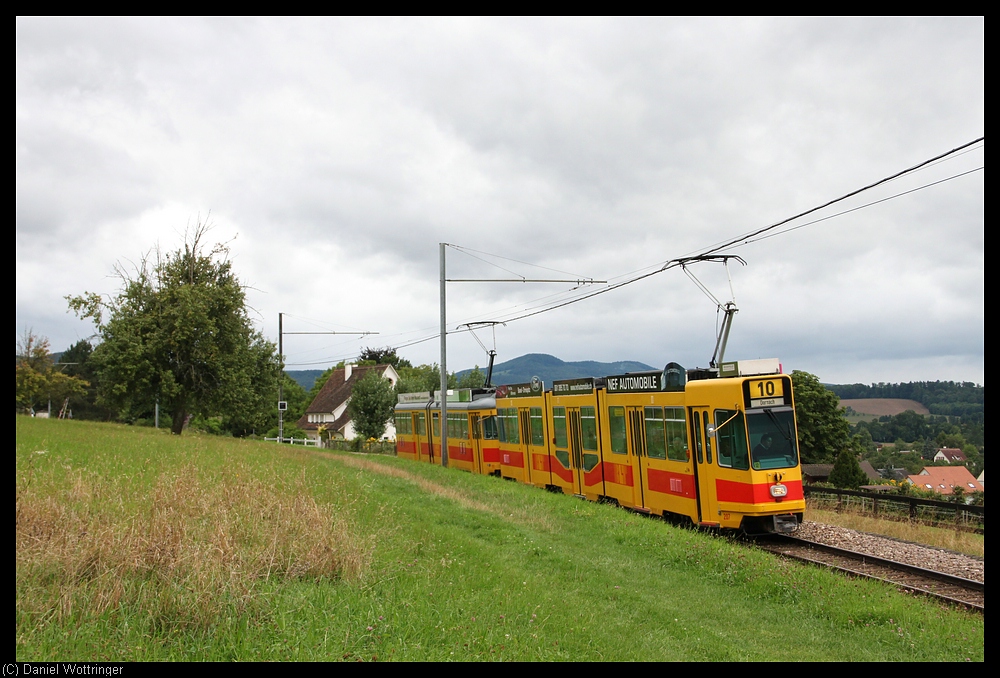 Ein Zug aus einem Be 4/8 und einem Be 4/6 durchfahren den französischen Teil der Birsigtalbahn.