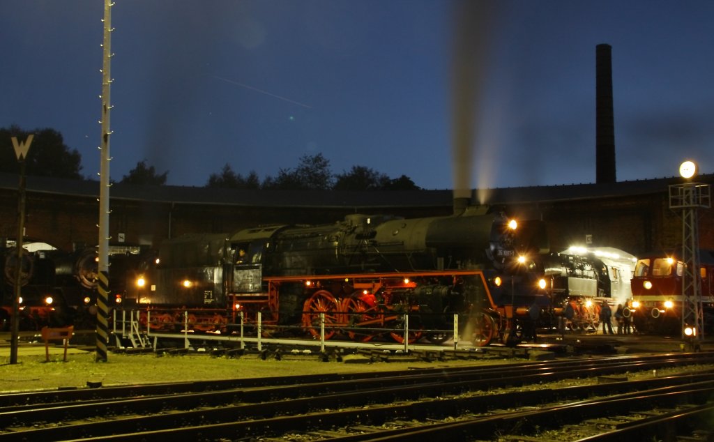 Am 21.08.2010 fand traditionell zum Auftakt des Chemnitzer Heizhausfest im Sächsischen Eisenbahnmuseum eine Nacht-Fotoveranstaltung statt. Zu Beginn der blauen Stunde haben sich alle betriebsfähigen Dampfloksoks, die auf die Drehscheibe passen, im Haus 1 versammelt.