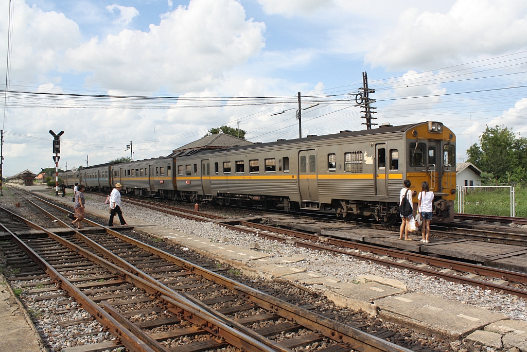 THN 1105 fährt am 22.August 2010 als EXP-DRC 76 (Nong Khai - Bangkok) im Bf. Ayutthaya ein. Man beachte die Form des Bahnsteiges. Warum der im Bild links hinten sichtbare Bahnsteig nicht benutzt wird entzieht sich meiner Kenntnis.