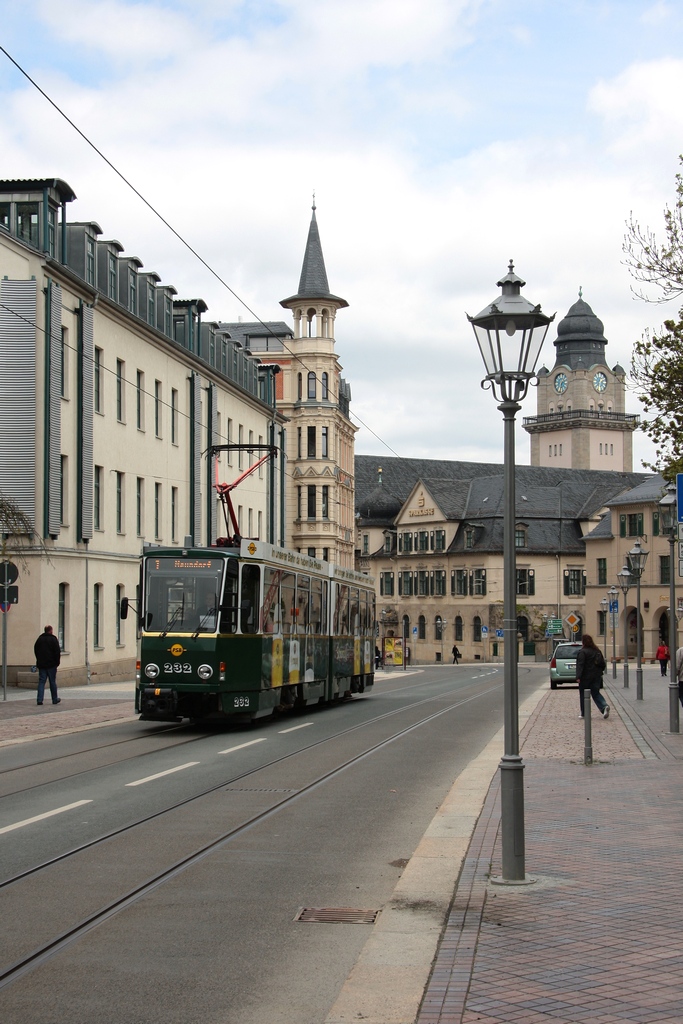 Tw 232 (ČKD Prahe Smichov, Bauj. 1988) unterwegs auf der Linie 1 nach Neundorf, vor der Hst. Hans-Löwel Platz, am 12.05.2010.