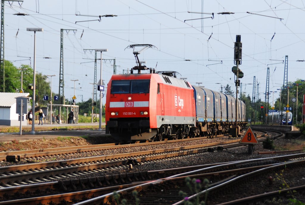 Heute ist 152 001-4 dran, den taegliche blauen Containerzug von Hamm in oestliche Richtung zu ziehen. Hier im Brackweder Bahnhof am 21.06.2010.