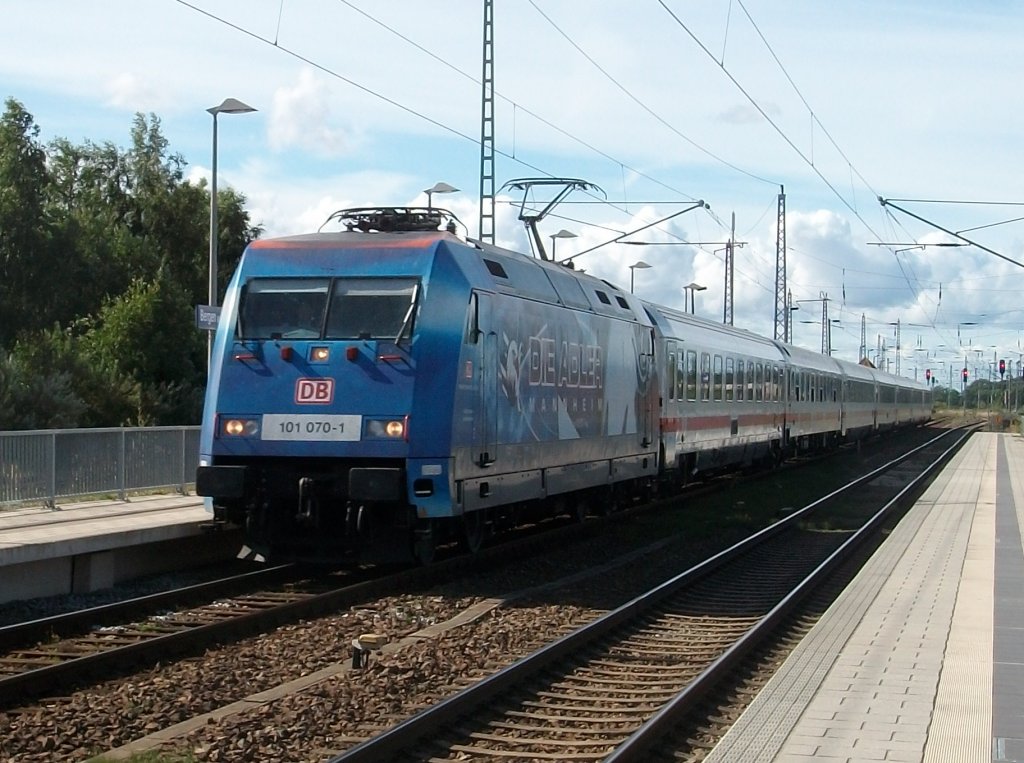 101 070 und der IC 2184 Hannover-Binz am 03.September 2010 bei der Einfahrt in Bergen/Rügen.