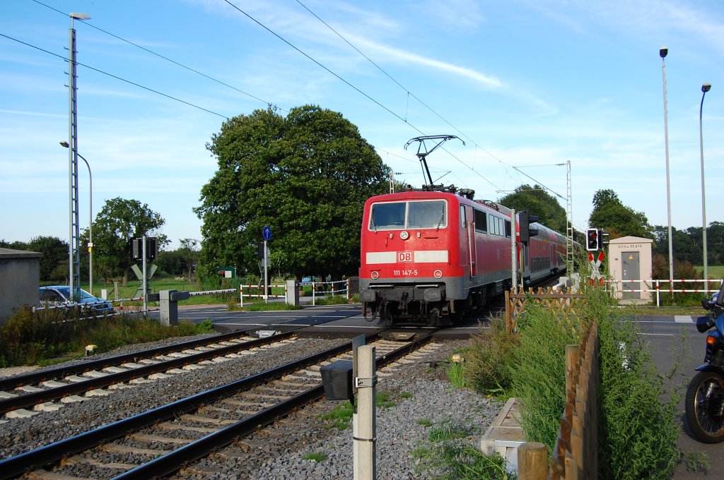 Schiebung betreibt hier 111 147-5 bei einem RE 4 Zug auf der KBS 485 bei Würm. 6.9.2010