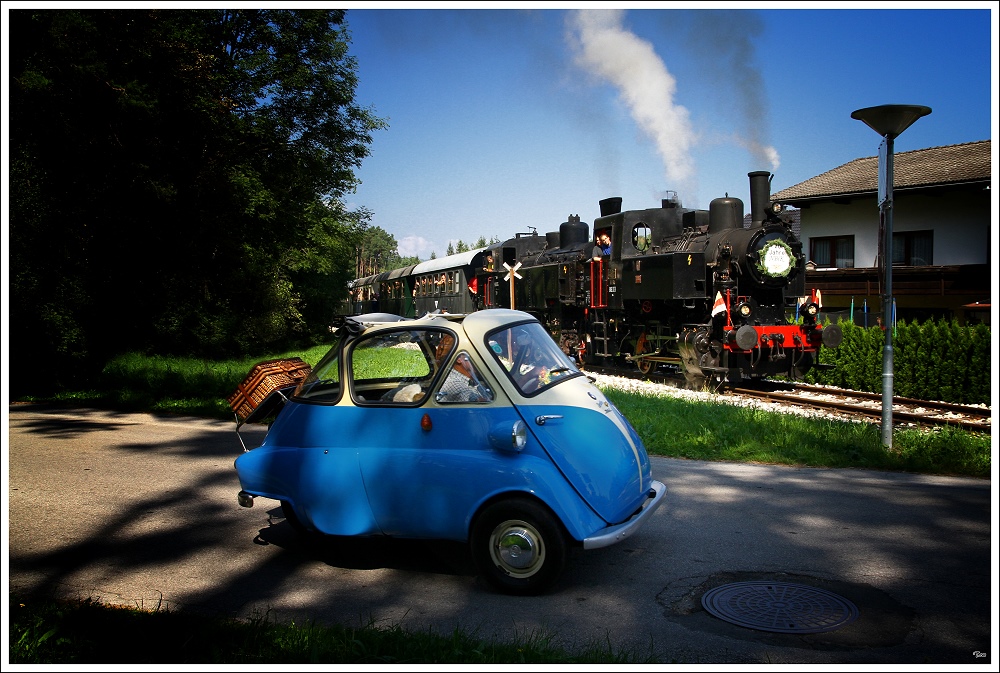 88.103 + 93.1332 der NBiK (Nostalgiebahnen in Kärnten) auf der Fahrt von Weizelsdorf nach Ferlach. Anlass für diese Fahrt war das Jubiläum 20 Jahre NBiK.Nett war auch der Autocorso mit vielen liebevoll restaurierten Oldtimern, wie diesem BMW Isetta.