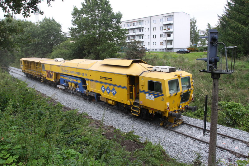 In Hagenow arbeitet sich die Schotterplaniermaschine SSP 110 SWB der Gleisbau-Busching-Wagner GmbH unter der Brücke durch. 08.09.2010