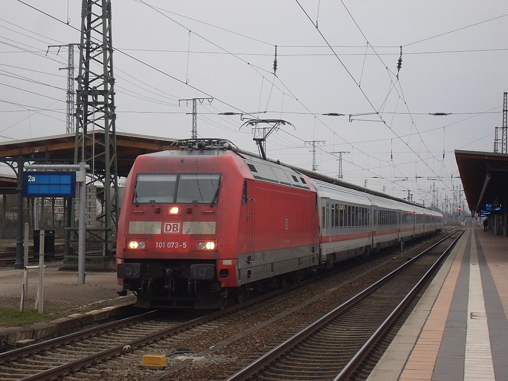 101 142-8 mit dem IC 143 von Schiphol (Airport) nach Berlin Ostbahnhof mit einem zusätzlicher Halt in Rathenow. Der IC 143 hatte wegen Verspätung im Ausland zu diesem Zeitpunkt eine Verspätung von 15min gehabt. 01.04.2011