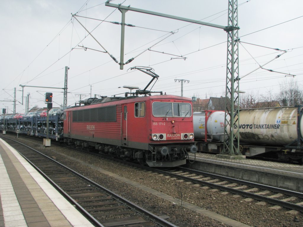 155 240-5 ist am 30. März 2011 mit einem Kesselwagenzug bei Kronach unterwegs.