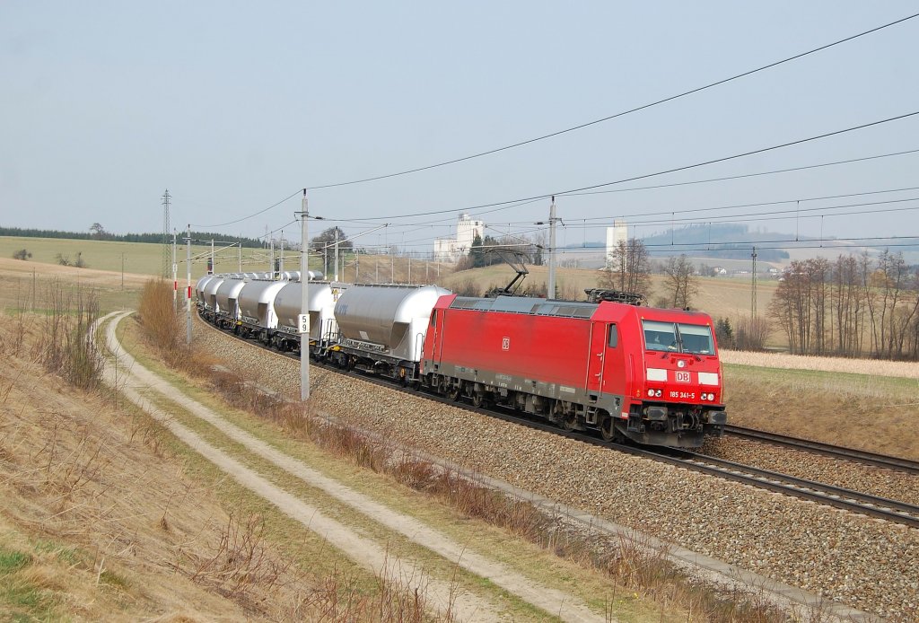 BR 185 fährt mit einem obligaten Getreidezug Richtung Wien, am späten Nachmittag des 30.03.2011. Die Aufnahme entstand kurz vor Neulengbach.