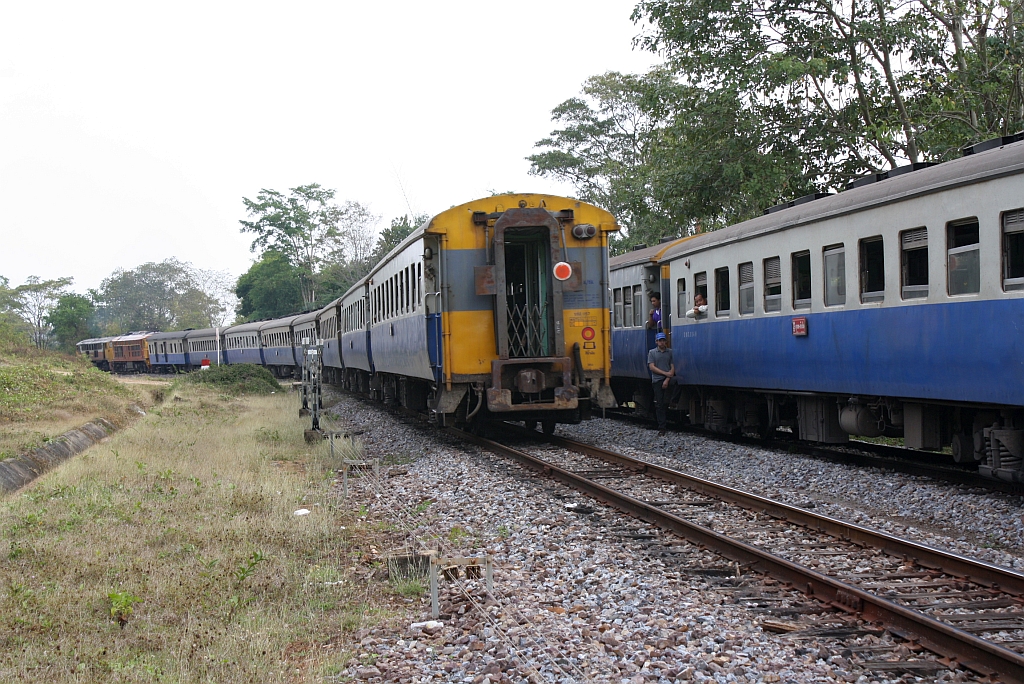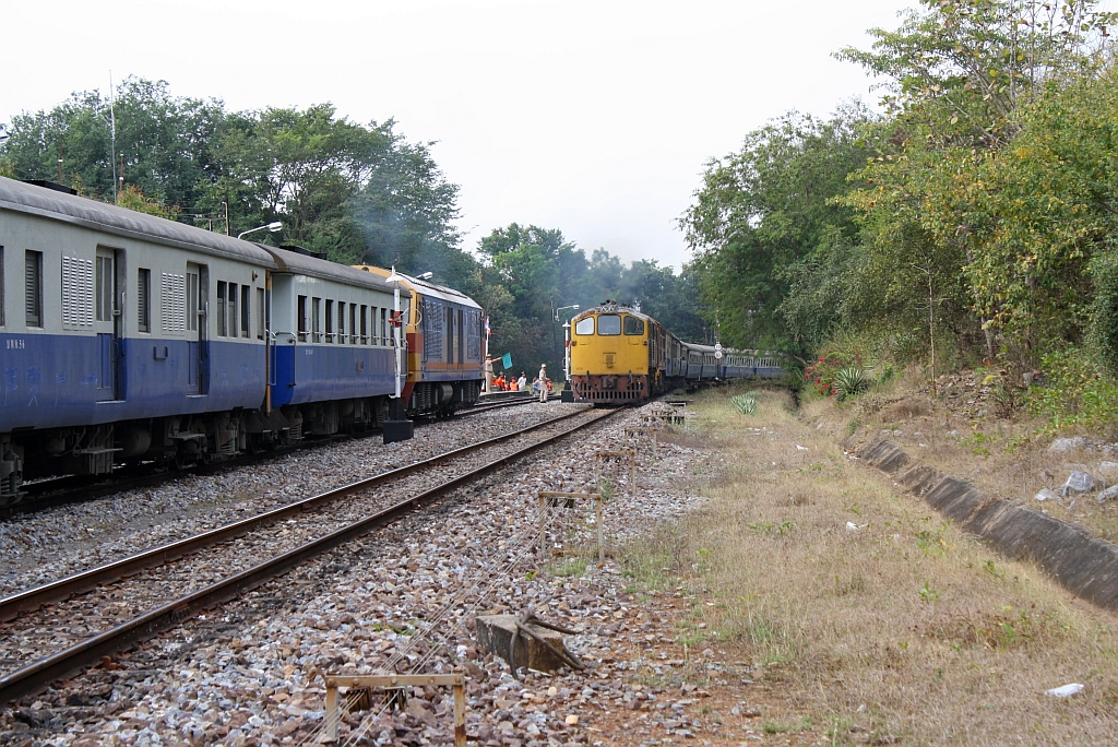 Kreuzung des RAP 102 nach Bangkok, links im Bild, mit dem EXP 51 nach Chiang Mai am 10.Jänner 2011 im Bf. Mae Tha.