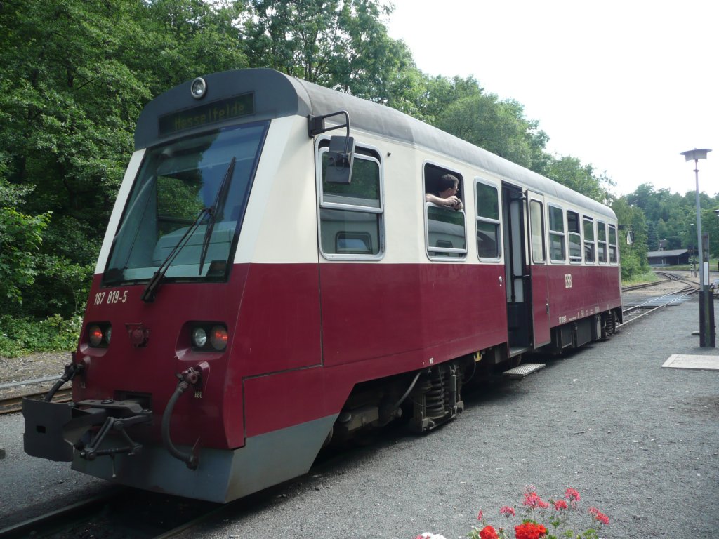 Kreuzung mit Triebwagen 187 019-5 von Quedlinburg nach Hasselfelde (vor der Abfahrt in Alexisbad) (26.06.10)