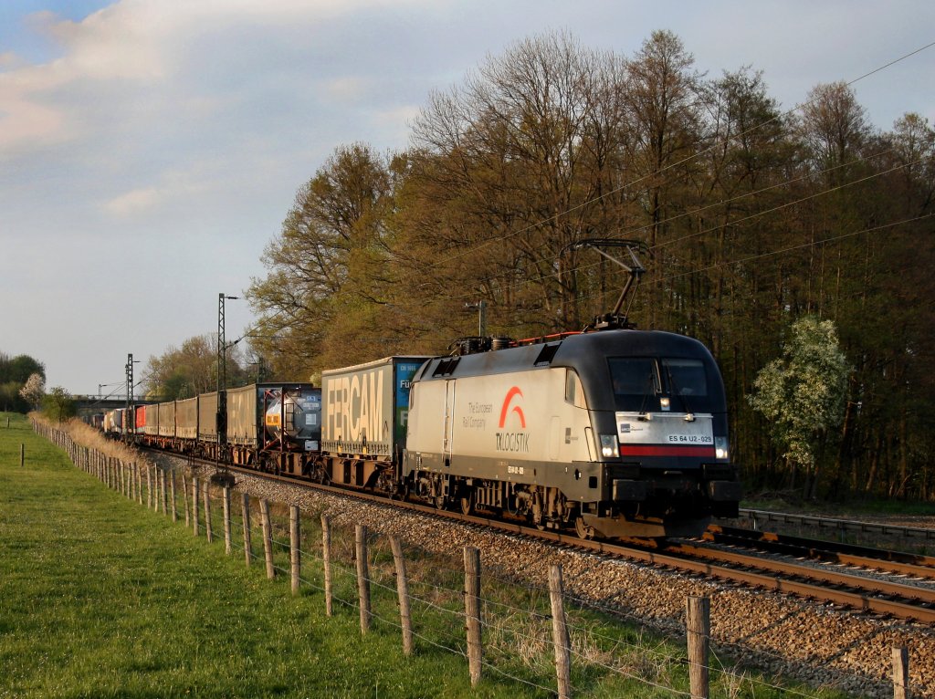 Die ES 64 U2-029 am 16.04.2011 mit einem KLV-Zug unterwegs bei Großkarolinenfeld (BÜ Vogl).