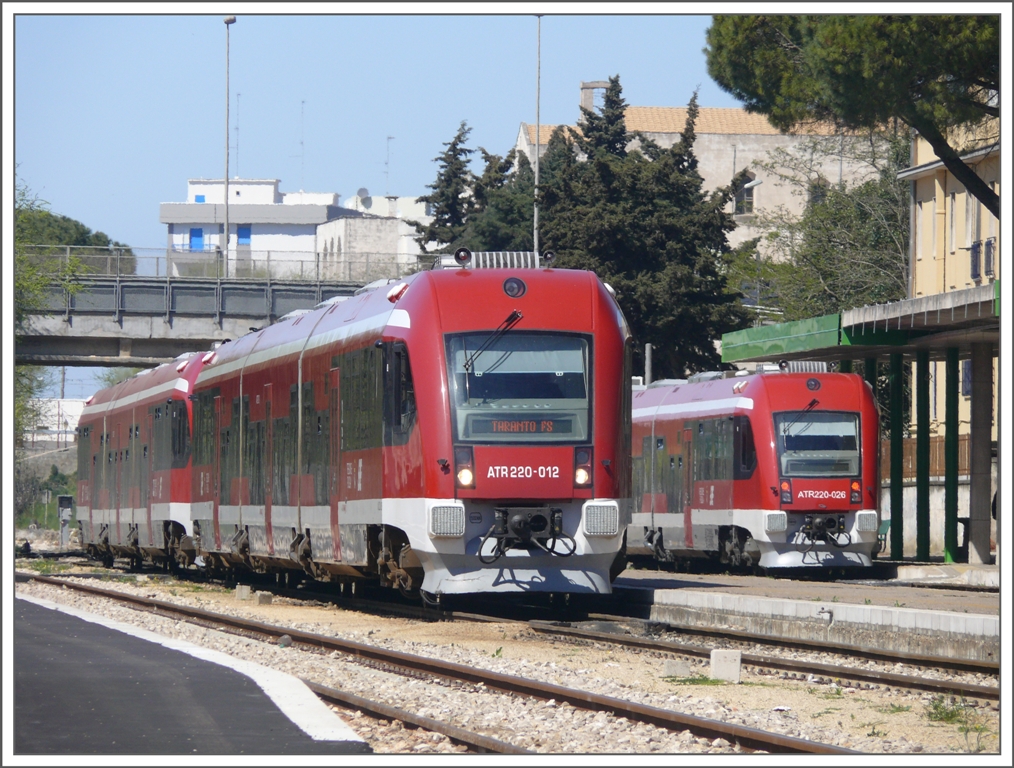 Die Ferrovie del Sudest in Apulien hat eine grosse Menge neuer Triebzüge der polnischen Marke Pesa erhalten. Hier traffen wir gleich drei ATR 220 in Martina Franca zwischen Taranto und Lecce.