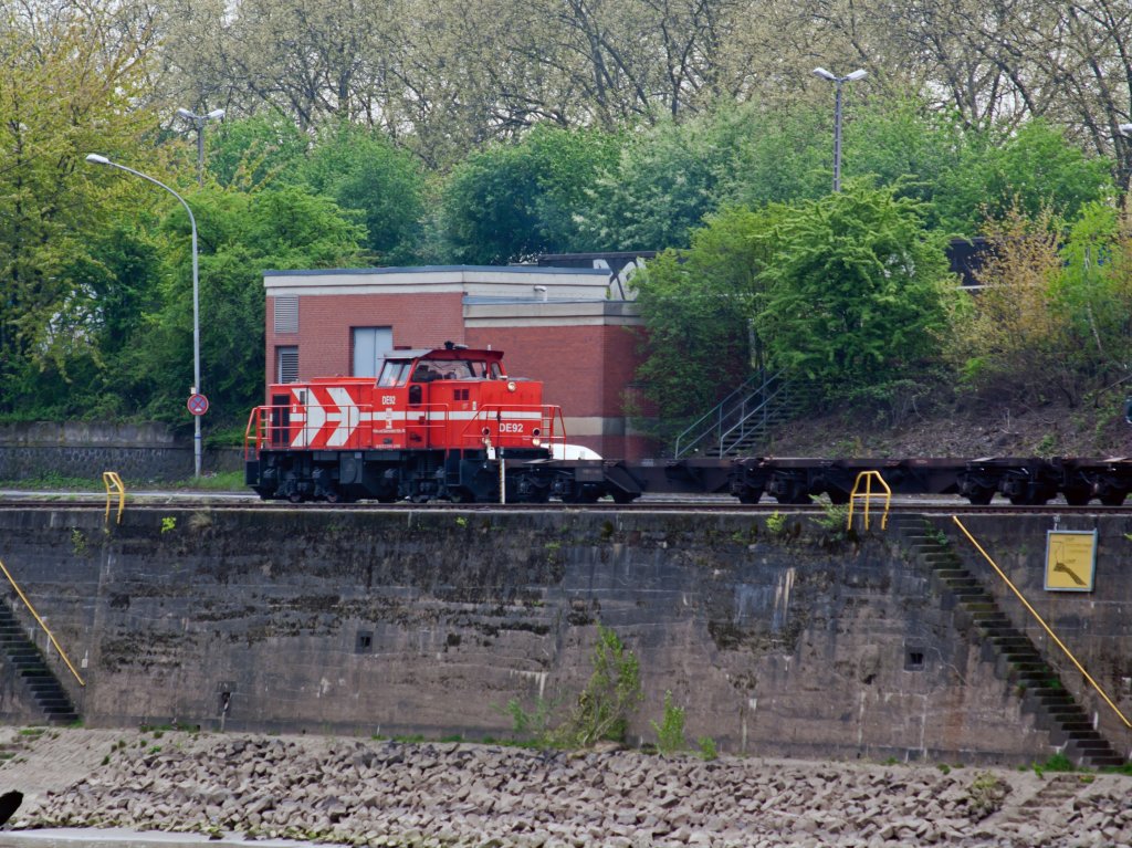 Lok DE 92 der HGK (Häfen und Güterverkehr Köln AG) rangiert leere Containertragwagen am 14.04.2011 im Hafen Köln-Niehl. Die Lok ist eine MAK DE 1002, Baujahr 1987. Das Bild wurde auf einer Hafenrundfahrt gemacht.