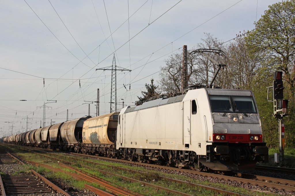 Captrain E 186 239 schleicht am 6.4.11 mit einem Getreidezug durch Ratingen-Lintorf