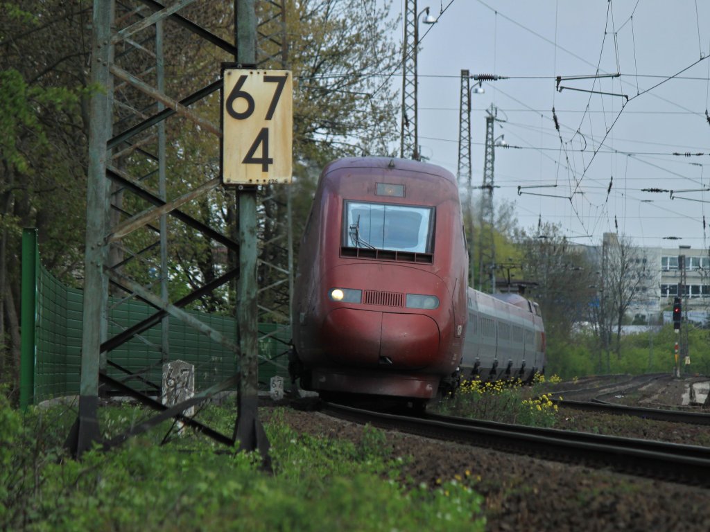 Ein auf dem Weg nach Aachen Hbf schielender Thalys am 16.04.2011 auf der KBS 480 bei Aachen Rothe Erde.