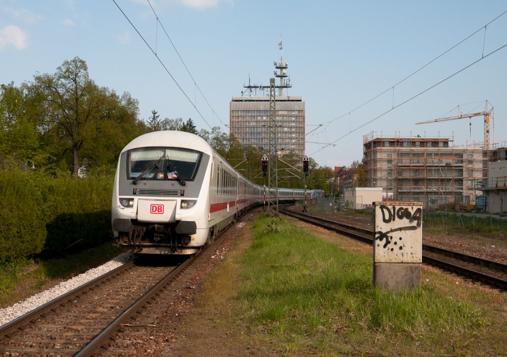 Ein Intercity München-Berlin durchfährt am 17. April 2011 den Bahnhof Hochstadt am Main. Als Zuglok fungierte eine Baureihe 101, bei der Wagengarnitur dürfte es sich um die ehemaligen "Metropolitan" Wagen handeln.