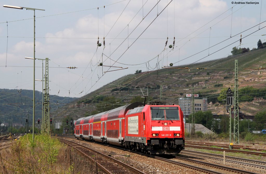 BR 146 114-4 beschleunigt am 18.04.2011 in Emmendingen ihren RE nach Basel Bad Bf.