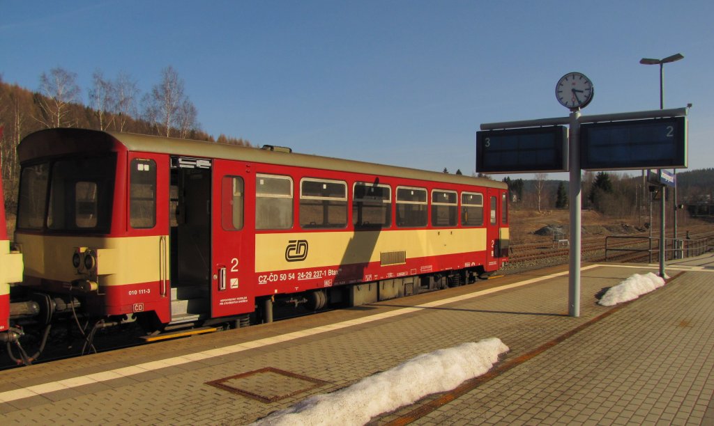 16.4.2011 16:49 VT 35 der Vogtlandbahn aus Sokolov nach Falkenstein (Vogtland) bei der Ausfahrt aus dem Bahnhof Oloví.
