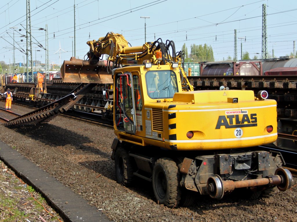 Ein 50to Kran der Firma Schweerbau verläd am 17.04.2011 in Aachen West 15m lange Gleisjoche auf einen Bauzug. Hinter dem Kran trennt ein Team die Schienen mit einem Brenner am Schienenfuß und Steg. Der Schienenkopf bleibt intakt, weil der Kran zum beladen noch üder das Gleis fahren muß. Die Schienenköpfe werden mit einem Zweiwegebagger, der am Gleisende im Schotter steht gebrochen, indem er das Joch aus dem Schotter hebt.