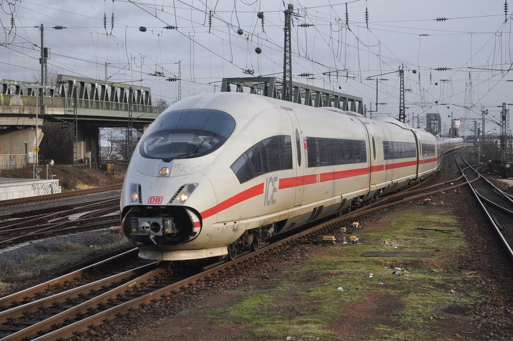 Luftaufnahme des ICE2 "ESSEN" von der Strassenbrücke über den Bahnsteig in Angermund. Er kam am Sonntagmittag den 3.4.2011 aus Duisburg herangefahren.