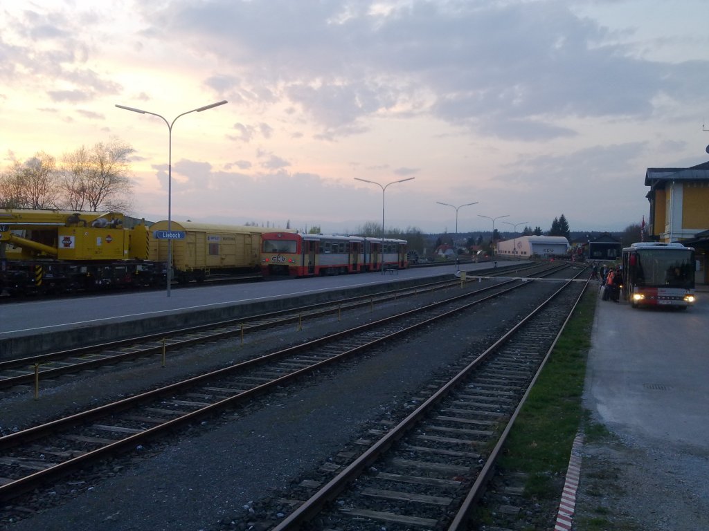Auf Grund einer Strecken Renovierung wurde S7 am 3.4.2011 nur von Graz bis Lieboch und dann weiter von Söding-Mooskirchen nach Köflach geführt. Daher waren den ganzen Tag über immer wieder Züge im Bahnhof Lieboch abgestellt. Hier sieht man VT 70.06 der gerade als R8429 aus Graz ankam und nun wartet um als R8440 zurück nach Graz Hbf zu fahren. Rechts im Bild sieht man den Autobus der als Schienenersatzverkehr herangezogen wurde um die Fahrgäste von Lieboch nach Söding-Mooskirchen und zurück zu bringen.
