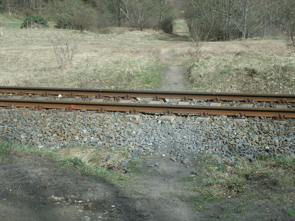 Illegaler Bahnübergang an der Strecke Bergen/Rügen-Lauterbach Mole bei Bergen/Rügen am 04.April 2011,der schon jahrelang als Abkürzung genutzt wird.