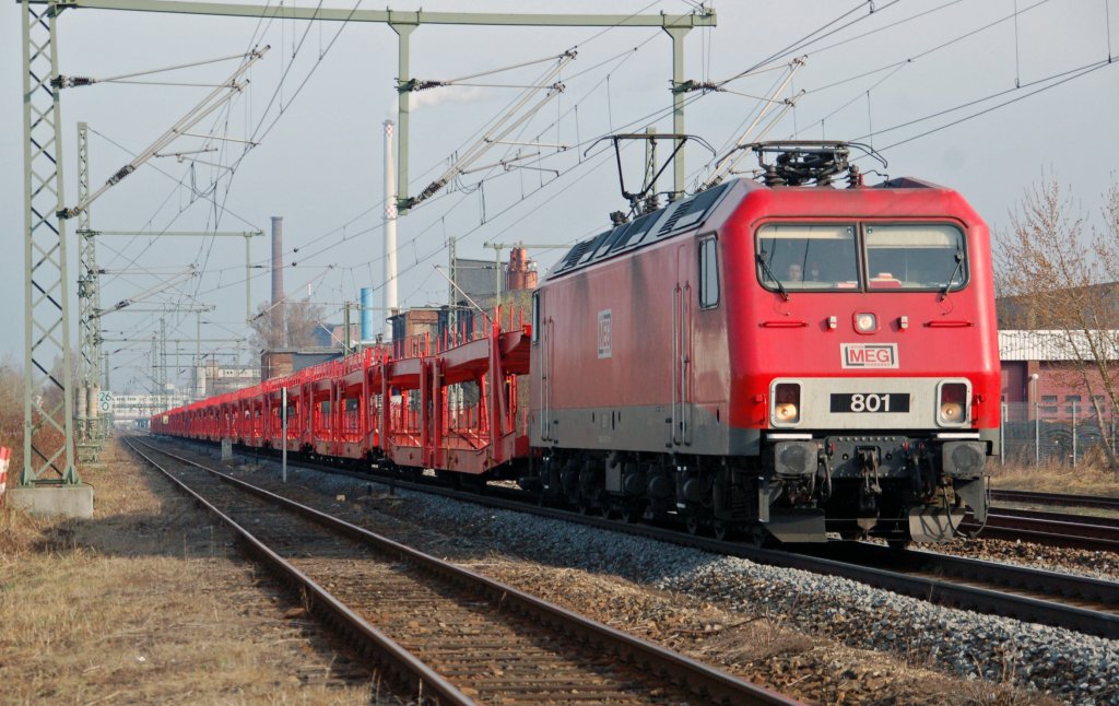 MEG 801 zieht am 02.04.11 einen Ganzzug Autotransportwagen durch Dessau Richtung Bitterfeld.