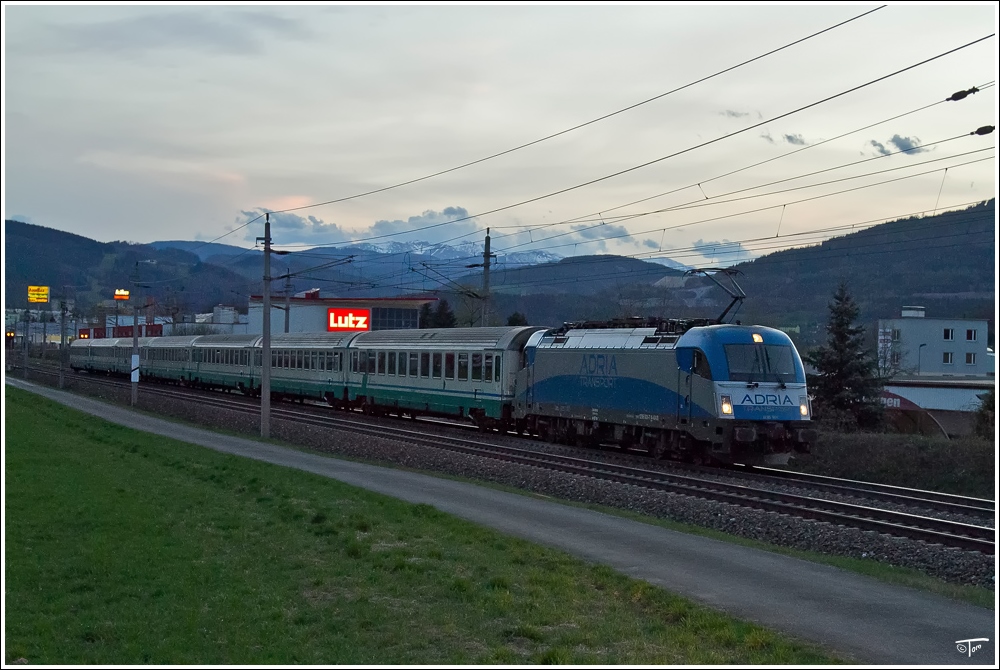 1216 921 der Adria Transport fährt mit FS Reisezugwagen durch das Murtal.Leider nicht rauschfrei, aber es war schon fast 20 Uhr.