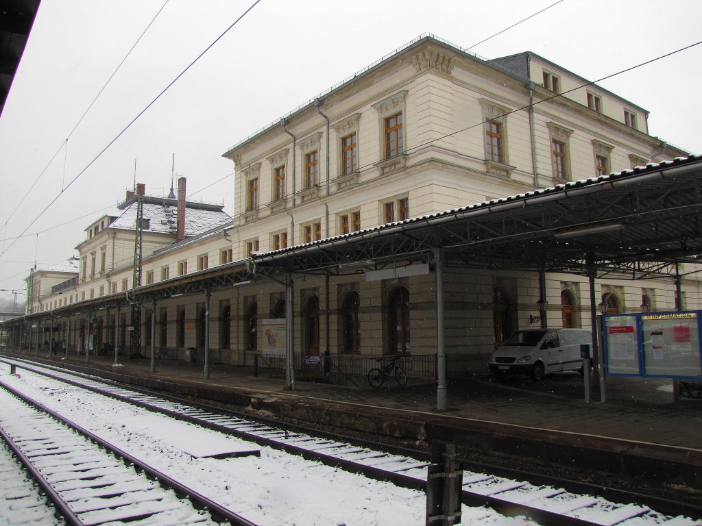 Das Bahnhofsgebäude und der Bahnsteig 1 in Altenburg; 24.01.2011