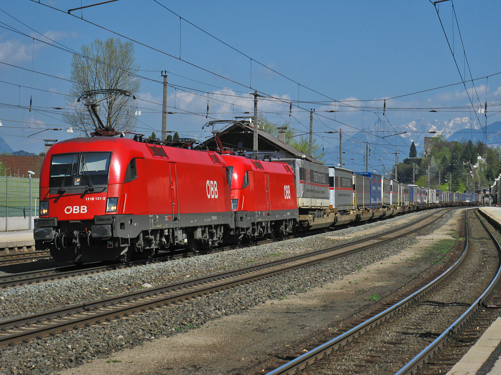 1116 131 und eine weitere Schwesterlok mit einem KLV-Ganzzug ebenfalls Richtung Italien durch Brixlegg ( 9.4.2011 )