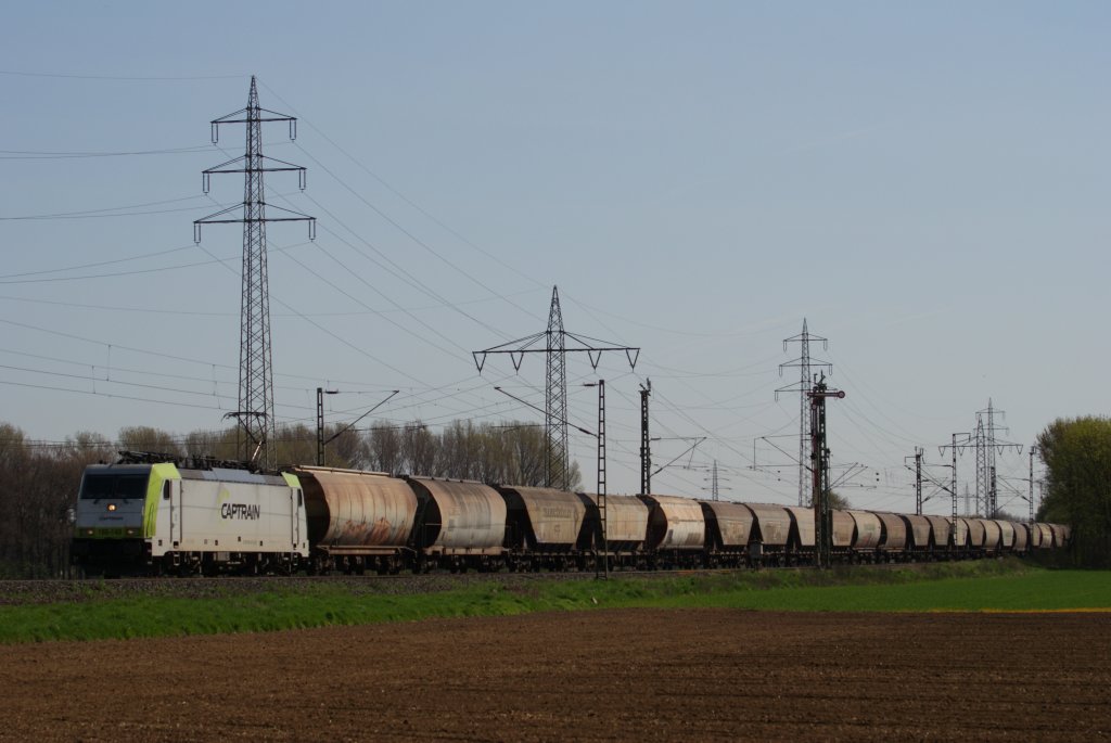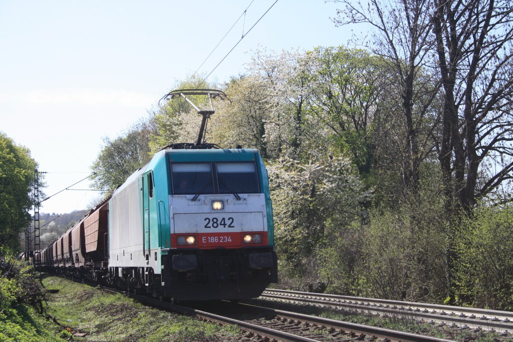 Die Cobra 2842 kommt mit einem Getreidezug aus Belgien fährt nach Aachen-West auf der Montzenroute am Gemmenicher-Weg bei schönem Frühlingswetter. 9.4.2011