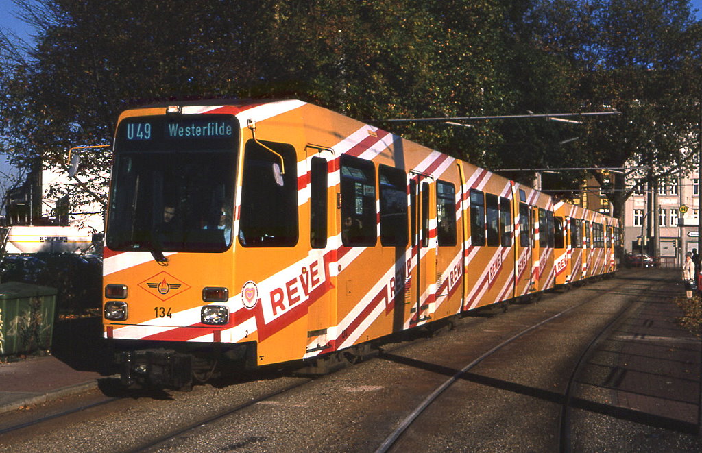 Dortmund Tw 134 und 136 in der Mallinckrodtstraße unweit der Hafenwache, 23.10.1990.